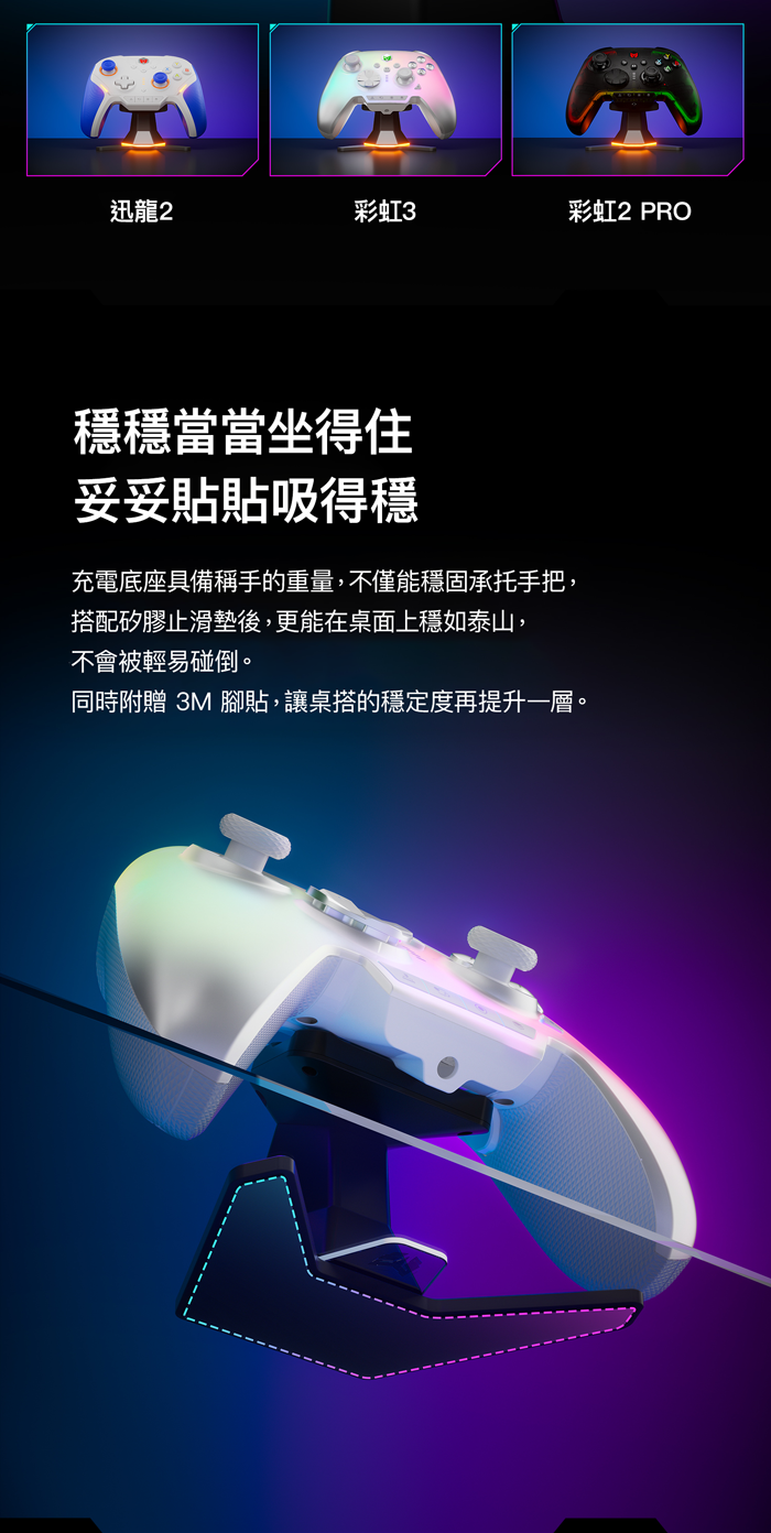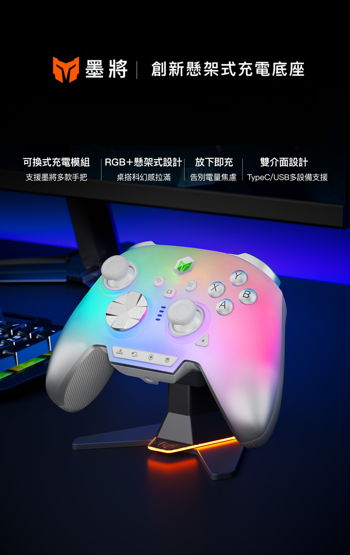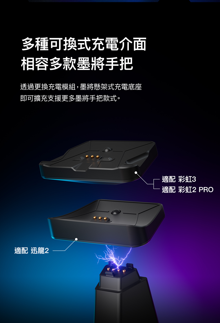 支援多款墨將手把,並採用可更換式充電模組,透過切換充電接口即可擴充相容機型,包含彩虹3、彩虹2 PRO、迅龍2 等多款手柄。