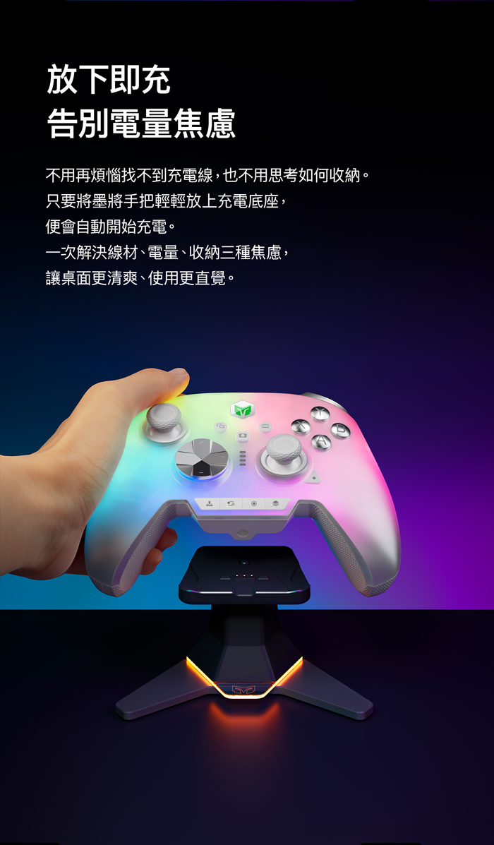 墨將創新懸架式磁吸充電底座,以未來感十足的懸浮設計打造獨特桌搭體驗。手把置於底座上時,彷彿懸浮於半空,結合 Aurora RGB 燈光效果,營造宛如科幻艦船停泊的視覺氛圍。