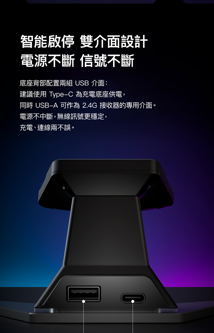 背部搭載 Type-C 與 USB-A 雙介面設計,Type-C 用於底座供電,USB-A 則可作為 2.4G 接收器專用接口,維持穩定訊號輸入,電源不斷、連線不中斷。